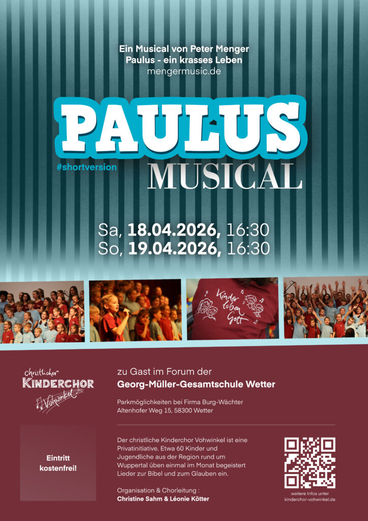 Bald ist es soweit – wir bringen das Paulus-Musical von Peter Menger auf die Bühne (in gekürzter Fassung). Und das gleich zweimal! Komm doch vorbei und bring noch Deine Freunde mit – wir freuen uns auf Euch!